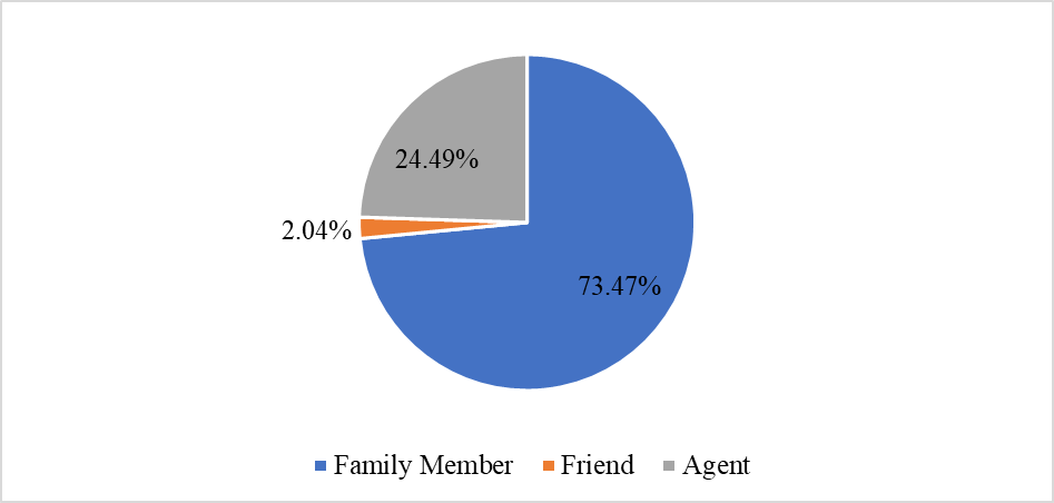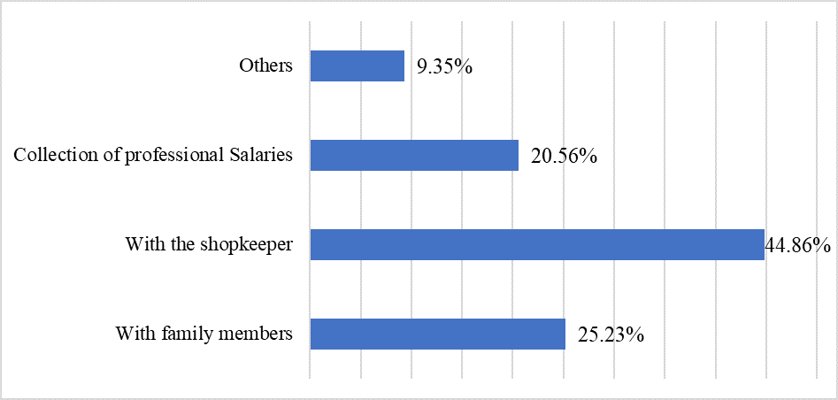 This bar chart (Figure 7) shows with whom the mobile banking user group makes the most transactions. They make the most transactions with shopkeepers, which is 44.85%. Second, 25.23% of respondents make transactions with family members. Professionals use it for salary collection, 20.56% of respondents. The Other categories have the least amount, 9.34% of respondents.