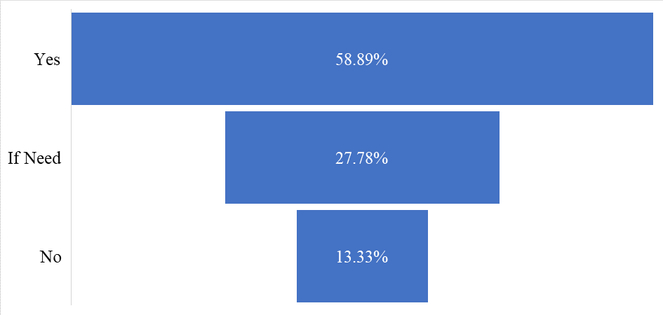 This funnel chart (Figure 10) illustrates the attitudes of mobile banking non-users regarding the adoption of MBS in the future. Among the 90 non-user respondents, 58.88% expressed an intention to adopt MBS in the future. Additionally, 27.77% indicated that they would adopt the service if necessary, while 13.33% stated that they do not plan to adopt mobile banking in the future.