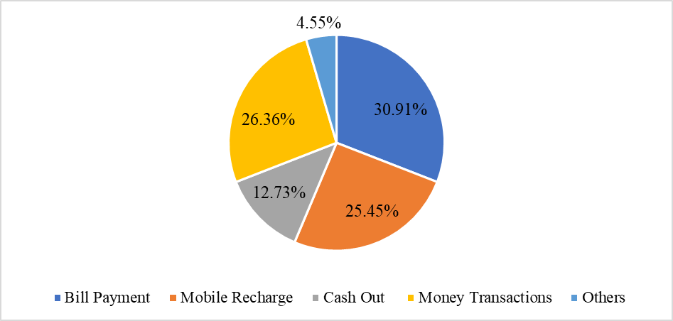 This pie chart (Figure 5) is used to present the scenario of mobile recharge. It is 30.91% of respondents who use it for bill payment. Secondly, 26.36% of respondents use it for money transactions. Thirdly, 25.45% of respondents use it for mobile recharge. 12.73% of respondents use mobile banking accounts more for cash out. Finally, 4.54% of respondents utilize other services from their mobile banking account.