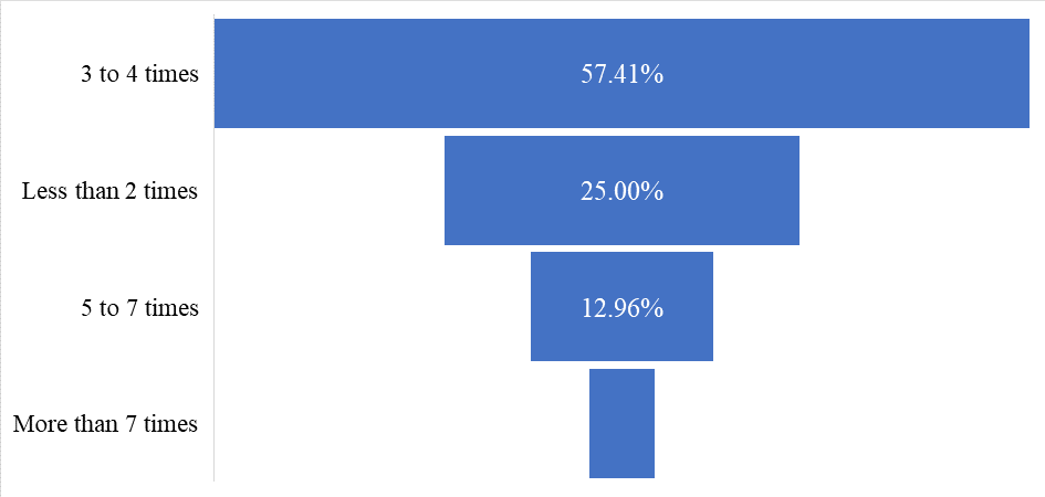 The funnel (Figure 6) chart illustrates the frequency of mobile banking usage among respondents in a month. According to the data, the most significant proportion of respondents (57.41%) use MBS 3 to 4 times per month. Additionally, 25% of respondents use the service less than 2 times a month, while 12.96% use it 5 to 7 times. Only 4.63% of respondents use MBS more than 7 times per month. This indicates that the majority of users rely on MBS moderately, with 3 to 4 uses per month being the most common, while a small minority use the service more than 7 times per month.
