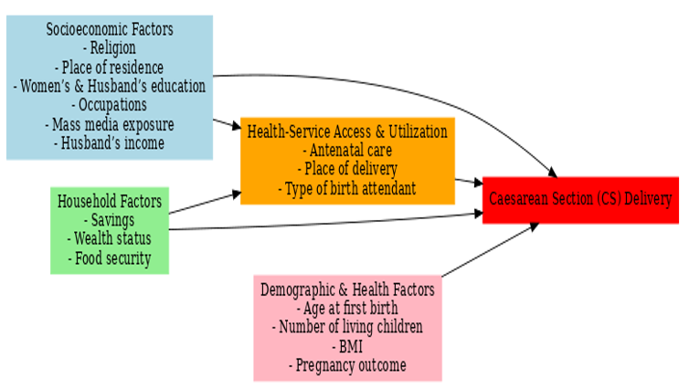 Figure 1 illustrates the conceptual pathways through which socioeconomic, household, demographic and health factors shape the likelihood of CS delivery. Socioeconomic and household factors influence access to and utilization of maternal health services such as antenatal care, delivery settings, and skilled birth attendance, which mediate their effects on CS delivery. Demographic and health-related factors exert both direct and indirect influences on the likelihood of CS delivery.