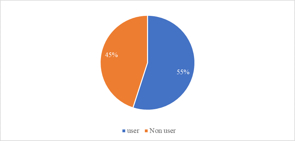 The total sample size for this study was 200. The sample is divided into two groups: users of mobile banking services and non-users. Respondents who had adopted mobile banking service accounts are categorized as the mobile banking service user group. In contrast, those who had not adopted mobile banking service accounts are categorized as the non-user group. Out of the 200 respondents, 110 had adopted mobile banking service accounts, while the remaining 90 respondents had not. The pie chart (figure 2) illustrates the percentage distribution of mobile banking service users and non-users. The mobile banking service user group constitutes 55% of the total sample, represented by the orange segment of the pie chart. In contrast, the non-user group makes up 45%, represented by the blue segment of the pie chart.