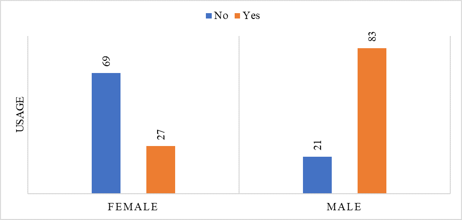 The data in Figure 3 provides insights into mobile banking usage among male and female respondents. Out of 200 participants, 110 have adopted MBS, while 90 have not. When analyzed by gender, a significant difference in usage patterns is observed.