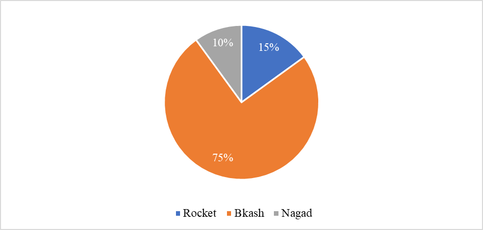 The pie chart (figure 4) illustrates the usage of different mobile banking tools among the 110 respondents who are mobile banking service users. These respondents use three types of mobile banking tools: Bkash, Rocket, and Nagad. The majority of respondents (75%) use Bkash, making it the most popular mobile banking tool.